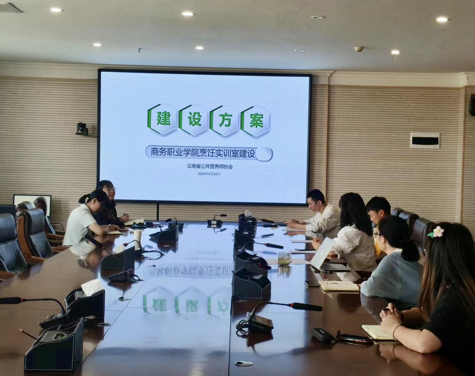 会议上,云南公共营养师协会与学校领导就实训室建设方案进行了深入探讨。会议明确了烹饪实训室项目建设的意义、实训室施工说明、平面布置图、施工效果等细节,并达成了烹饪实训室共建初步共识。