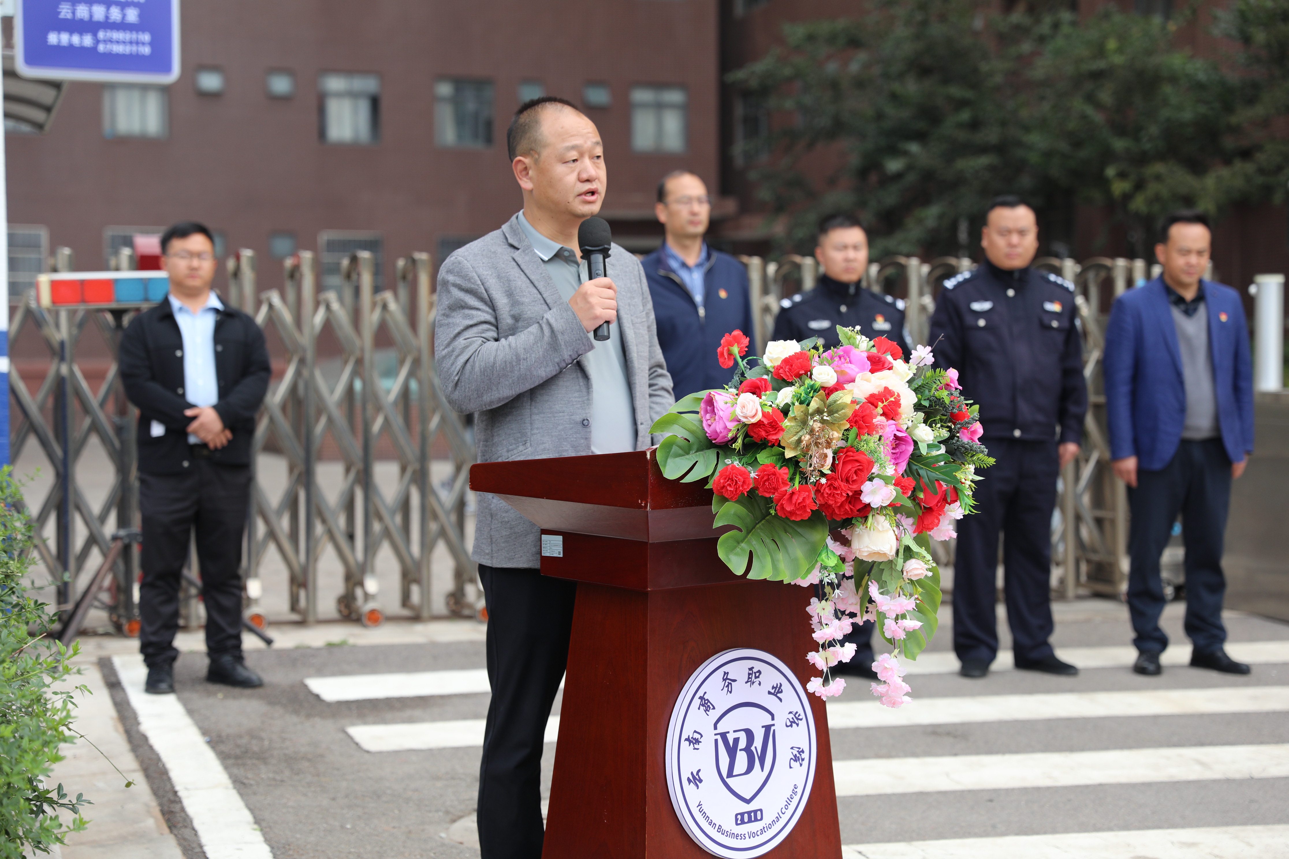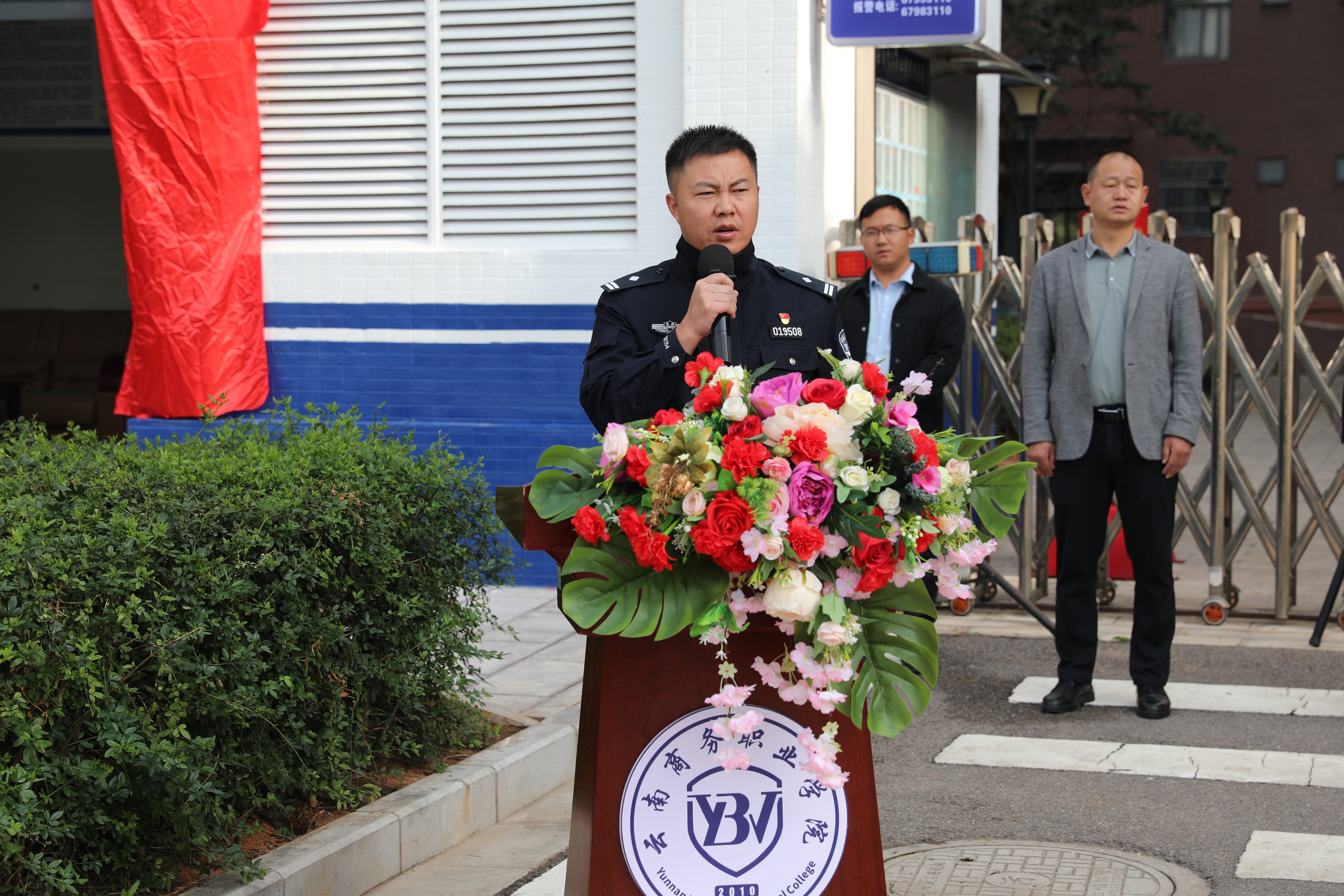副校长武绍宏在仪式上致辞,首先向龙保派出所长期给予云商安全、法制工作的指导、帮助和支持表示诚挚的感谢,对今天莅临仪式现场的李晓明副所长、杨志刚警官表示热烈的欢迎!他强调本次仪式举行的意义和重要性,他指出今天的仪式标志着云商在压降警情、法制教育、安全管理、维护师生权益、确保校园安全等安全管理方面迈出了坚实的一步。他对抓好、抓实压降警情及安全管理提出相关要求,再加强宣传、再加强管理、再加强联动。