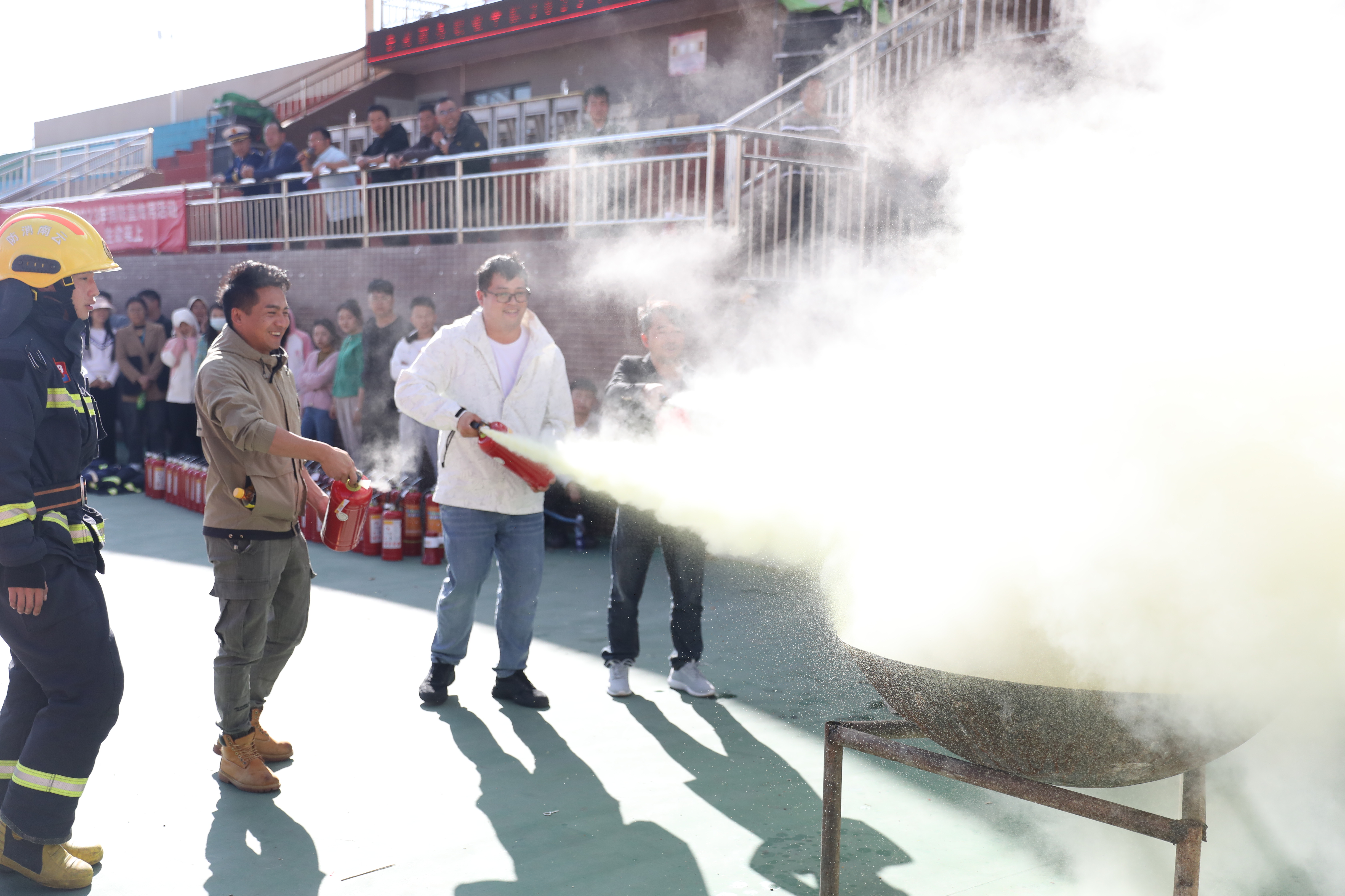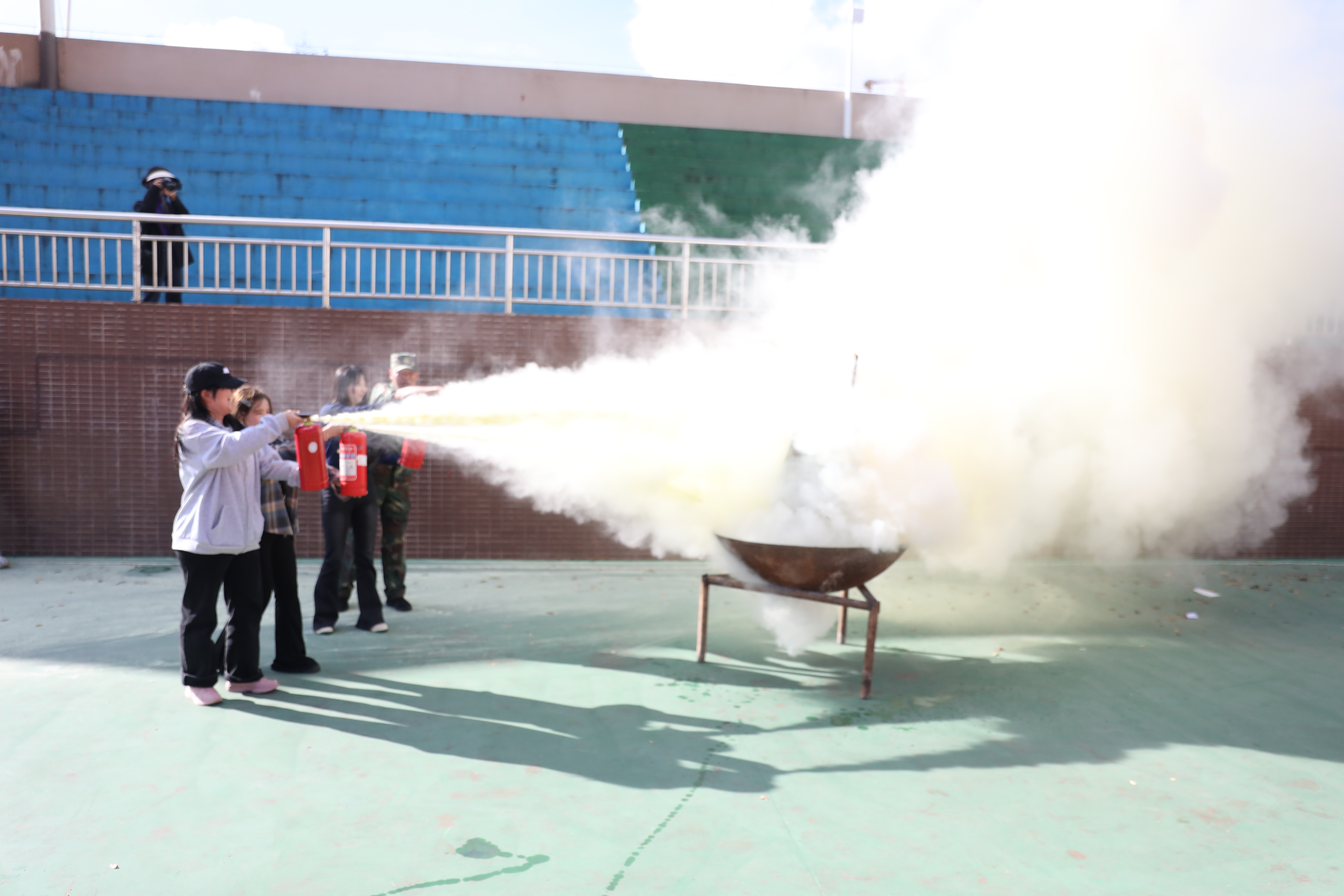 现场教学,指导师生遇到火灾如何使用消火栓、灭火器等消防设施。