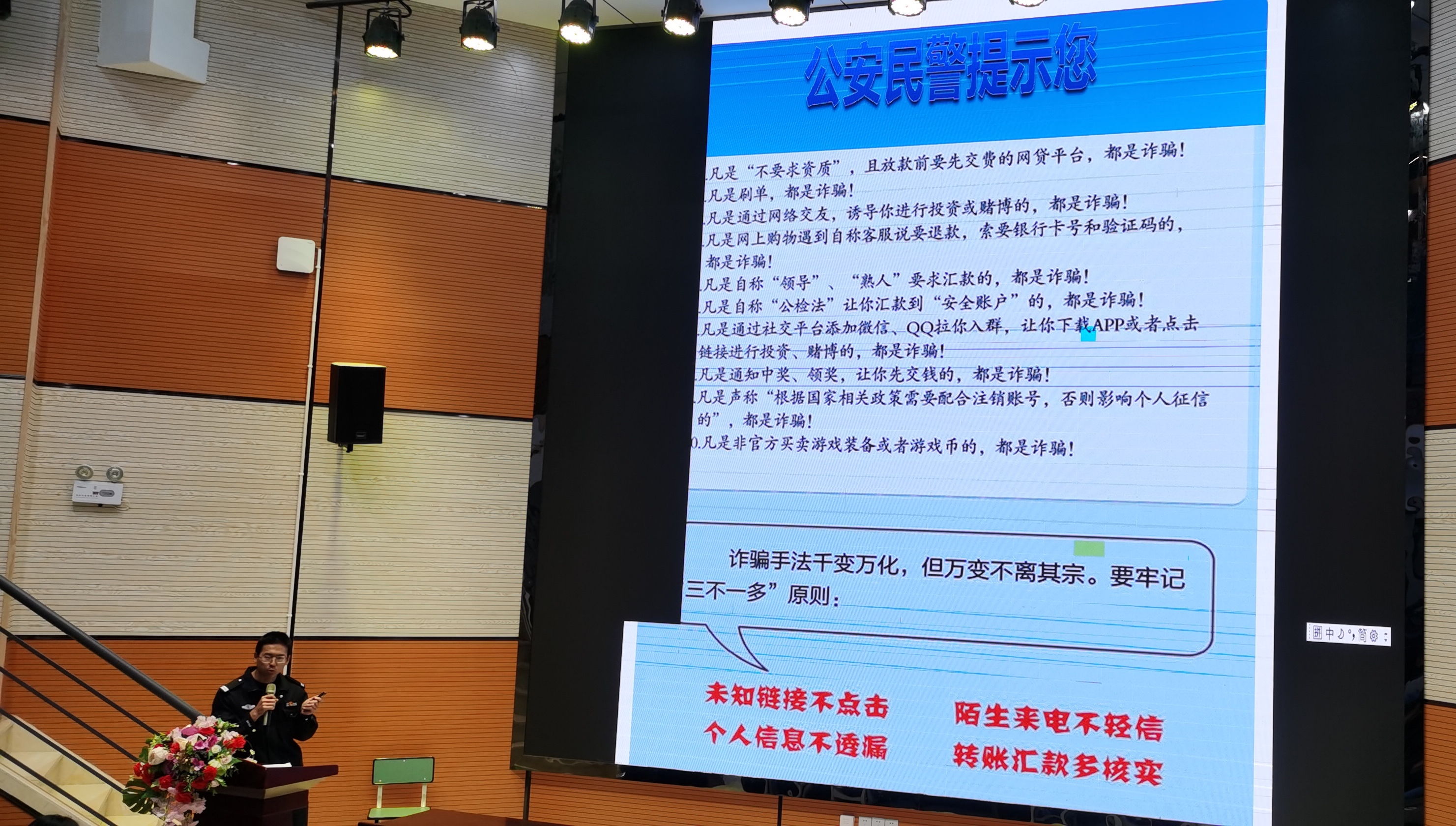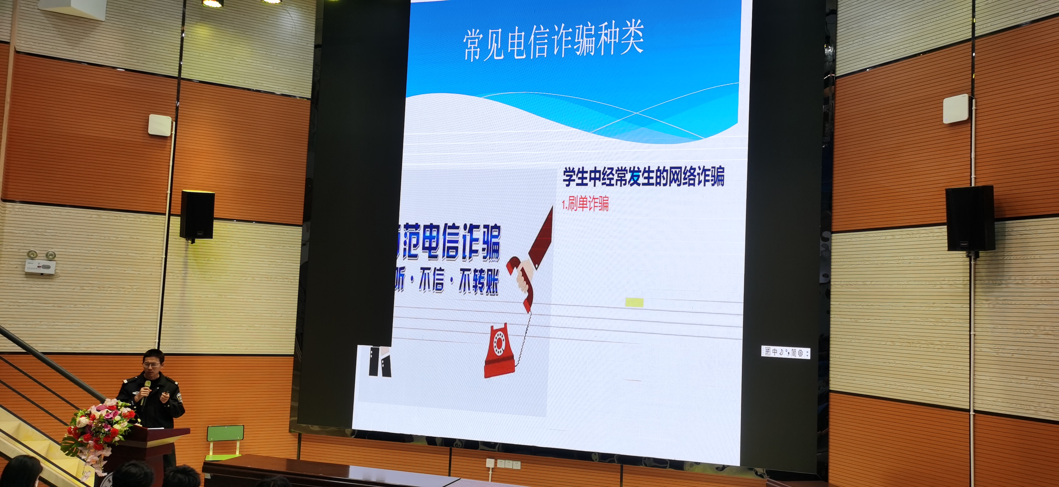 本次讲座围绕“属地报警67993110,怎么打?校园报警67983110,怎么用?”“预防电信诈骗10个凡是”“预防电信诈骗10个凡是”展开。通过警情案件事件、日常生活及相关急救常识、事故责任认定等多个方面进行了深入讲解,帮助学生树立正确的维权意识和法律意识,预防诈骗。