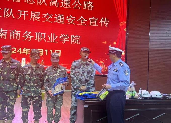 云南交警总队高速公路交巡警支队陈天宇队长用贴近生活的小事、触目惊心的案例,将“枯燥生硬”的交通安全法规,化作安全文明的“种子”,播散进学生心中,并围绕行车、骑车、酒醉驾、疲劳驾驶等知识点,组织同学们开展有奖竞答,同学们的精彩表现赢得阵阵掌声。活动现场气氛活跃,强化师生对交通安全重要性的认知,不仅是对自己的生命负责,也是对社会负责。大家纷纷表示将在日后的生活中自觉践行文明交通,争做文明交通典范。