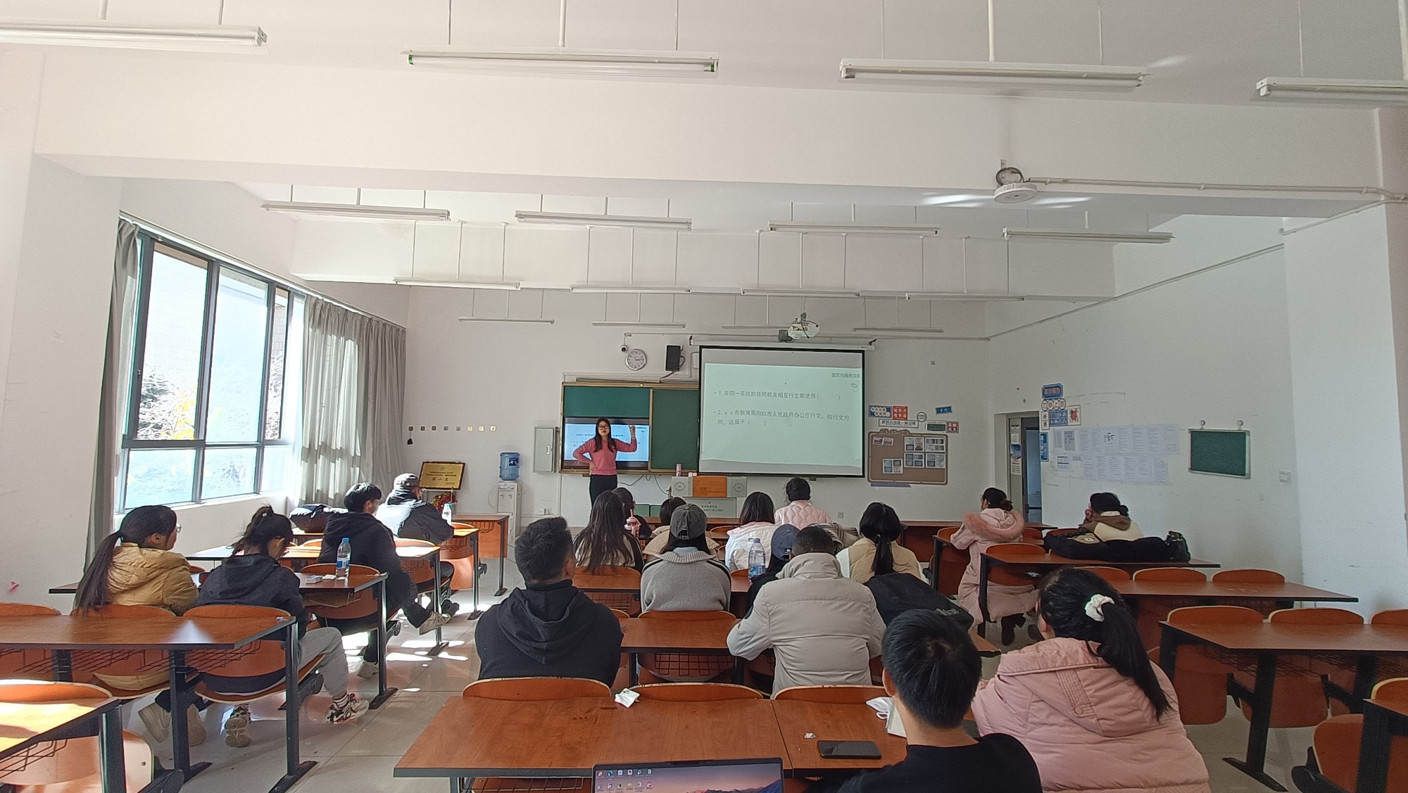 张丽君老师在公文写作课上。聚焦《通知》这一实用文种。课程伊始,张老师运用巧妙的方式导入新课,迅速激发大家的学习兴趣。在概念讲解环节,她深入剖析通知的定义、特点及行文方向,逻辑清晰,引人入胜。针对转发性通知、告知性通知等不同类型,张老师通过对比辨析和课堂练习,让学生们在实践中准确把握其差异。在讲解通知结构时,张老师别出心裁地将其类比为一个“人”,生动形象地阐述了标题、主送机关、正文,包括通知缘由、主体、结尾,以及落款,署名+日期,各部分的作用与写作要点,使复杂的知识变得通俗易懂。