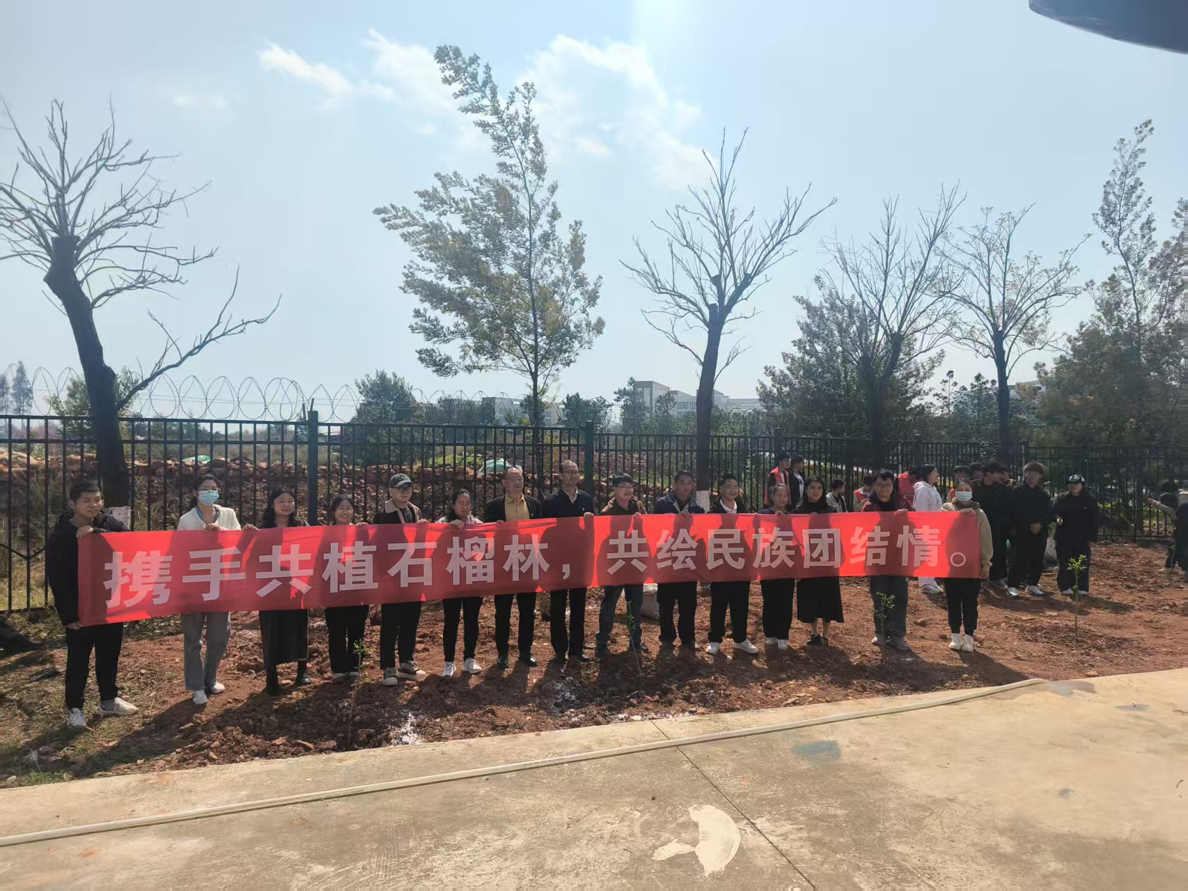 为了进一步铸牢中华民族共同体意识,在第47个植树节来临之际,中共beat365平台官方网站委员会组织开展“携手共植石榴林,共绘民族团结情”植树节活动,活动于3月12日下午14时开展,本次活动行政党支部共15人踊跃参与.