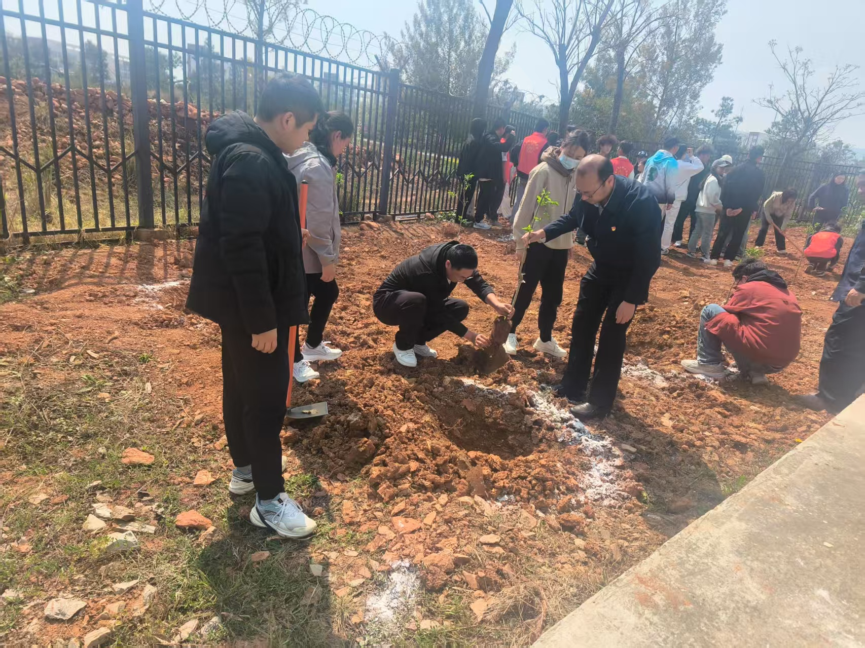 活动现场,大家带着对自然的敬畏与对民族团结的热爱,齐聚于指定的植树地点。现场,一棵棵石榴树苗整齐排列,等待着被赋予生命。参与活动的党员们热情高涨,他们分工明确,有的挥锄挖坑,有的小心翼翼地将树苗放入坑中,还有的忙着培土浇水。在大家的共同努力下,一棵棵石榴树苗稳稳扎根于土壤之中,迎风摇曳,展现出勃勃生机。