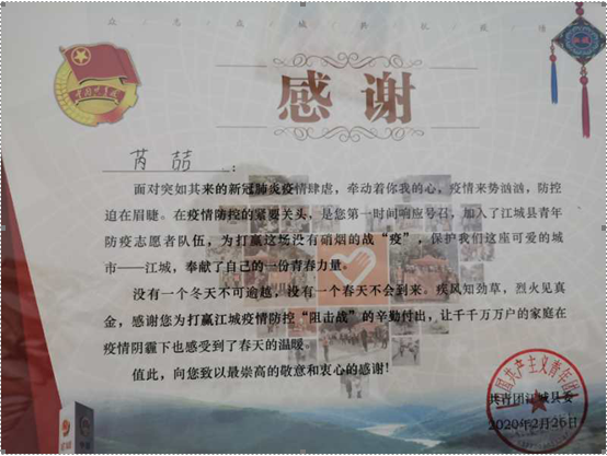疫情爆发后,2019级高职会计班芮喆同学,他带动身边的同学与朋友共同加入了江城县青年防疫志愿服务队伍,负责县重点隔离监测居民小区的值守。对进入小区的人进行登记和体温测量,对外出娱乐活动和串门聚会的居民进行劝导,为小区重点隔离对象进行24小时监测,给他们送生活物资,并对他们的体温进行定时测量,其志愿服务事迹得到当地政府和老百姓的广泛赞誉。