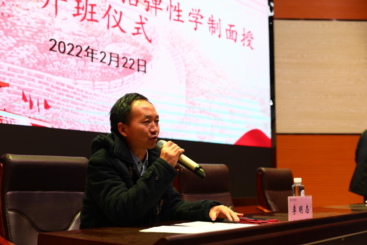 第四项议程,继续教育学院院长李明态发言。他说到我校根据云南省教育厅相关文件精神及要求,严格执行高职扩招弹性学制线上网络教学与线下面授相结合的混合式教学管理模式。每学年与大家在寒暑假都各有一次相见的机会,各位同学要认真坚持参加每次的面授教学工作。我对所有同学提出三点要求:一是要坚持学习,将学习作为一种习惯;二是要遵章守纪,崇尚文明;三是要提升素质,积极向上,以知促行,以行求知;四是要坚持线上网络学习,线下面授相结合。大家要充实自我、提高自我、完善自我。