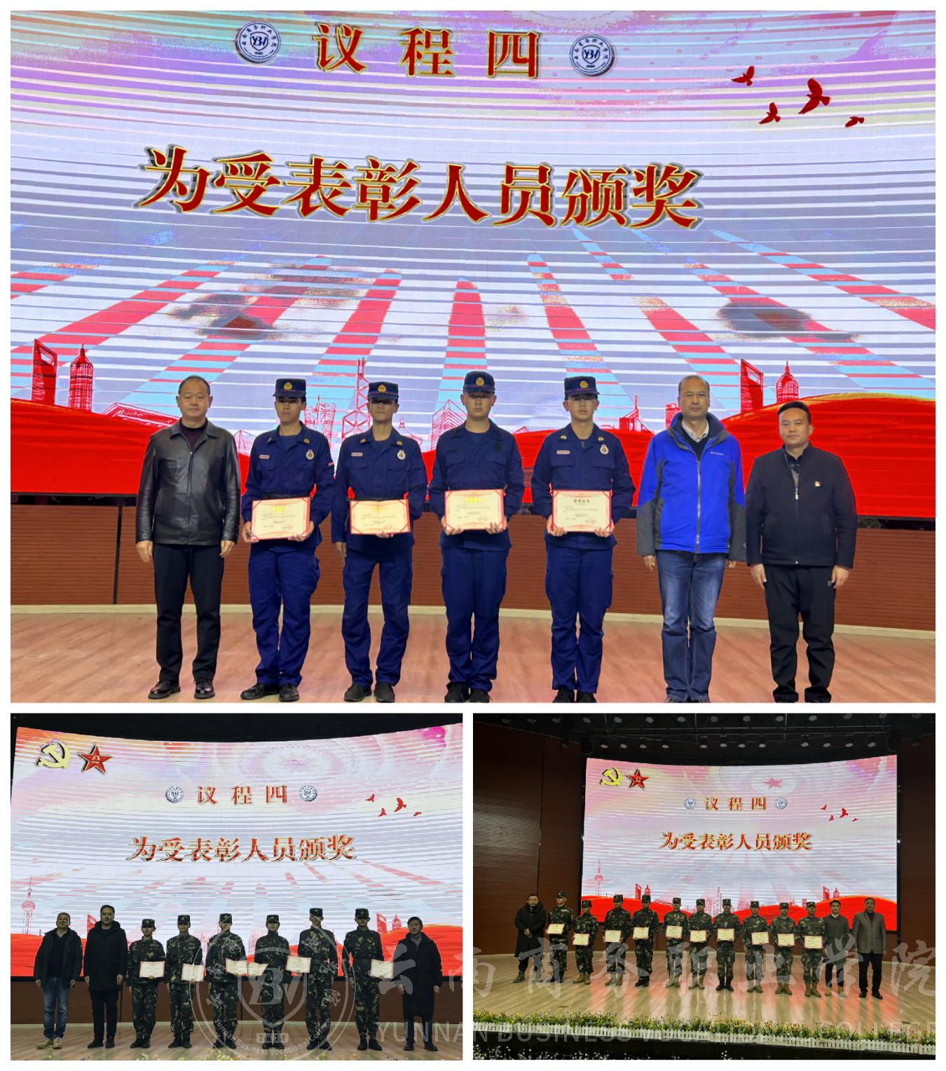 护理学院副院长石宇超同志、工信学院副院长魏祖林同志、应急管理学院副院长马波同志,为受表彰的10名“校园卫士”颁奖。党委办公室主任范伟同志、党委学生工作部副部长徐林勇同志、安全稳定处长李克明同志,为受表彰的6名“护旗标兵”颁奖。党委书记张向英同志、党委副书记郭新阳同志、副校长武绍宏同志,为受表彰的4名“应急尖刀”颁奖并亲切合影。