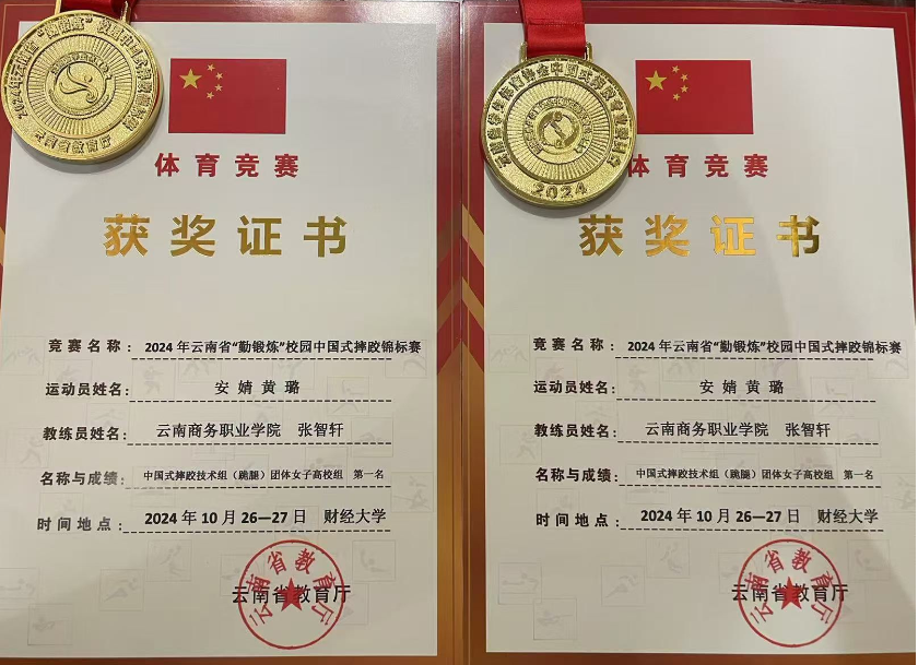 在女子团体组比赛中,黄璐和安婧两位同学凭借卓越的技艺和默契的配合,荣获“中国式摔跤技术组(跪腿)团体女子高校组金牌”。